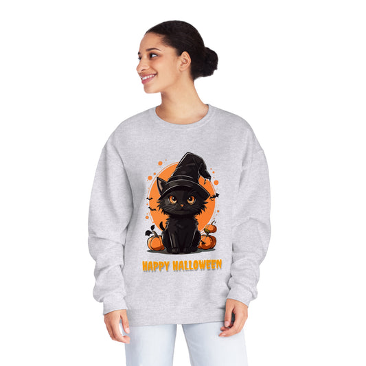 Halloween Cat Sweatshirt Unisex Funny Cat Witch Hat Graphic Shirt Gifts Spooky Long Sleeve Crewneck Shirt Tops